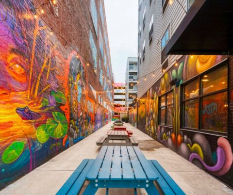The transformation of an old hotel into Cityplace Apartments exemplifies a strong commitment to sustainability. In addition to Cityplace, both Walnut View and 1010 Apartments feature green roofs and street trees in improved streetscapes. The Maple Street Garage showcases dedication to sustainability with a green roof, energy-efficient lighting, electric vehicle charging stations, and a 10,000-square-foot mural painted with pollution-absorbing paint. These innovative elements earned the garage an Apex Award for Sustainable Design.