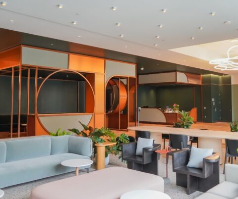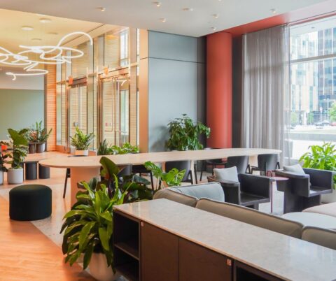 Sustainability and resilience are central to its design. LEED Gold v4 BD+C: CS certification reflects advanced mechanical systems that optimize energy usage, dual power feeds for reliability, & touchless technologies that enhance occupant health while reducing resource consumption. Green roofs help mitigate the urban heat island effect and manage stormwater, while outdoor terraces provide open-air spaces for relaxation, fostering a sense of well-being among tenants and visitors.