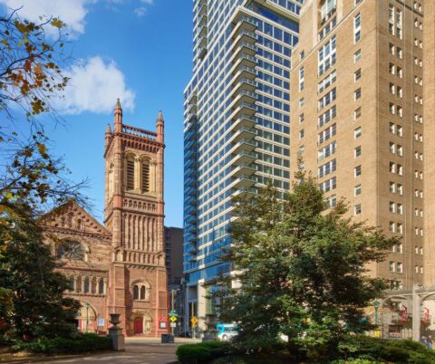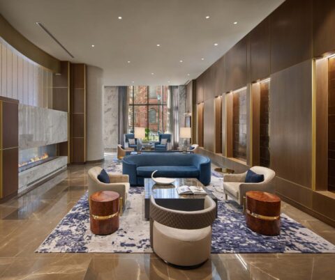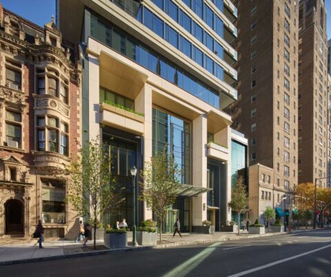 Along Walnut Street, an elegant base echoes the rhythms and stone of the neighboring rowhouses. The condominium entrance is marked by a prominent entry, with a regal iron-and-glass canopy evoking the Parisian Metro. Since a Walnut Street address is synonymous with prestige, the apartment residents also benefit from a distinct entry. Both public-facing entries, along with the building’s terraces, offer residents the replete Rittenhouse Square experience. Ample visual connections to the Square are woven throughout interior amenity areas on levels 4 and 27, as well as units’ private outdoor terraces.